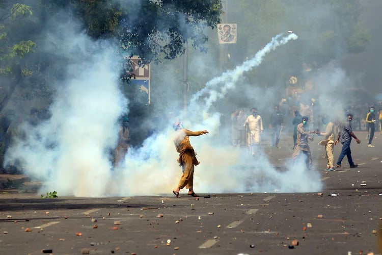 Supporters of Pakistan's former Prime Minister Imran Khan remove tear gas shell fired by police to disperse them during a protest against the arrest of their leader, in Lahore, Pakistan, May 10, 2023.