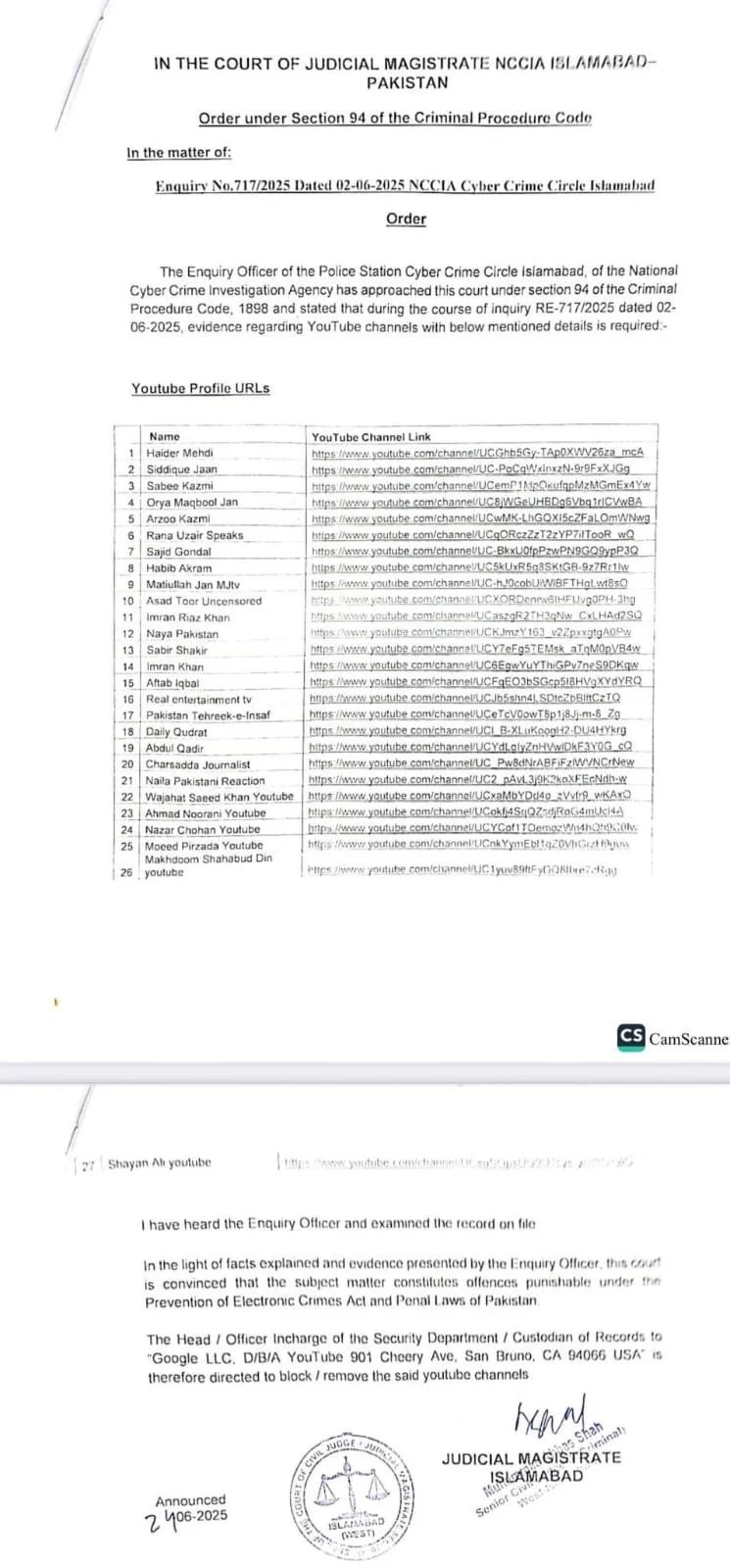 A court order designating YouTube channels as offenders under a controversial and improper application of the Electronic Crimes Act to surpress dissenting voices online.